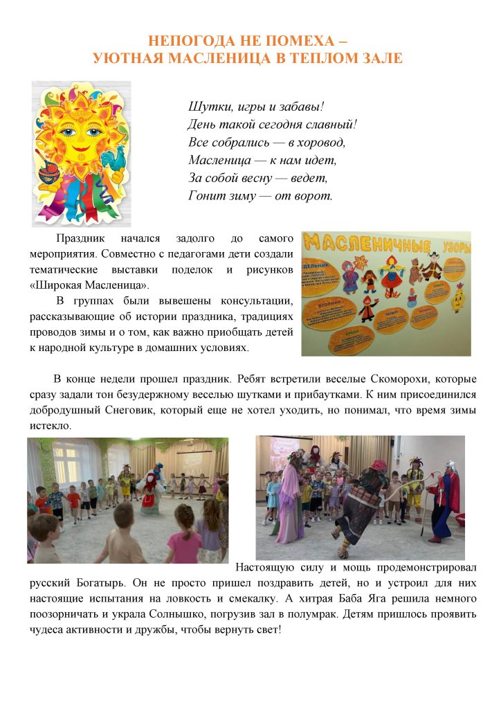 НЕПОГОДА НЕ ПОМЕХА – УЮТНАЯ МАСЛЕНИЦА В ТЕПЛОМ ЗАЛЕ детский сад24 февраля, 2026 Новости Комментариев нет ← ТВОРИМ, ИГРАЕМ, ПОБЕЖДАЕМ: 23 ФЕВРАЛЯ В КРУГУ СЕМЬИ И ДРУЗЕЙ (От Васильева Евгения) → Добавить комментарий Отменить ответВаш адрес email не будет опубликован. Обязательные поля помечены *Комментарий Имя * Email * Сайт Сохранить моё имя, email и адрес сайта в этом браузере для последующих моих комментариев. Δ Этот сайт использует Akismet для борьбы со спамом. Узнайте, как обрабатываются ваши данные комментариев.